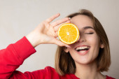 Zaskoczony brunetka dziewczyna pozuje z połówką pomarańczy, obejmujących oczy