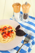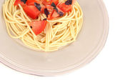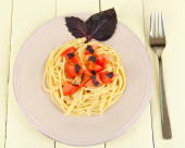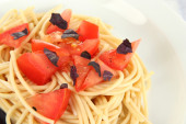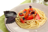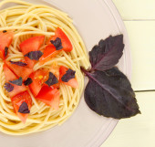 spaghetti z pomidorami i bazylią liście szczelnie-do góry
