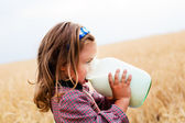 Mała dziewczynka na polu pszenicy. zdrowe dziecko na pikniku z chlebem i mlekiem na złotym polu zbóż.
