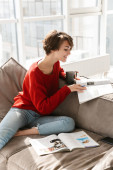 Zdjęcie "Szczęśliwa młoda kobieta siedzi na kanapie w domu" może być wykorzystywane do celów osobistych i komercyjnych zgodnie z warunkami zakupionej licencji Royalty-free. Obraz jest dostępny do pobrania w jakości wysokiej rozdzielczości do 5760x3840.