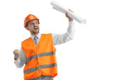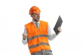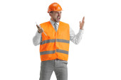 Konstruktor w pomarańczowy kask na białym tle