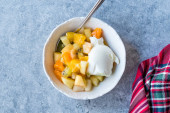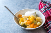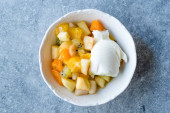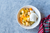 Sałatka owocowa z lodami waniliowymi miski ceramiczne.