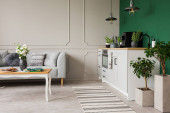 Okrągły stół kuchenny ze śniadaniem i róż w szklanym wazonie w szarym wnętrzu z metalową półką z naczykami