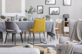Zdjęcie "Okrągły stół kuchenny ze śniadaniem i róż w szklanym wazonie w szarym wnętrzu z metalową półką z naczykami" może być wykorzystywane do celów osobistych i komercyjnych zgodnie z warunkami zakupionej licencji Royalty-free. Obraz jest dostępny do pobrania w jakości wysokiej rozdzielczości do 5760x3840.