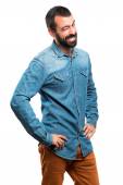Przystojny mężczyzna z brodą, cierpiących na bóle pleców o dokonanie wysiłek na na białym tle
