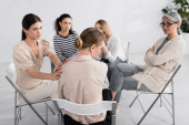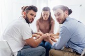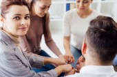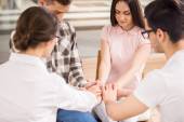 Grupa ludzi siedzi i ułożenia rąk podczas sesji terapii
