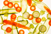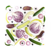 tło z pokrojone pomidory, ogórki, czerwona cebula, na szaro