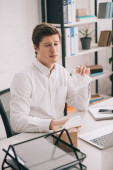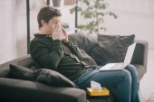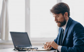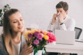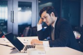 przystojny biznesmen trzyma tkanki patrząc na laptopie w biurze