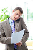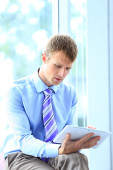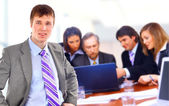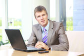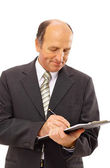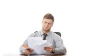 uśmiechający się biznesmen siedzi na krześle, na białym tle.