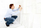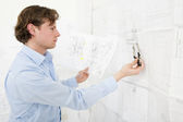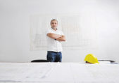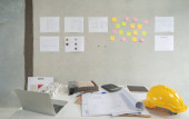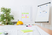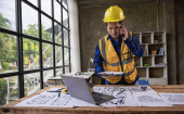 Pracownik budowlany sprawdza rysunki projektowe w biurze, nosząc kamizelkę saftety