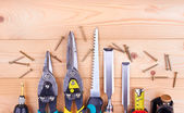 Narzędzia pracy na tle rustykalne drewniane. Widok z góry. Miejsce
