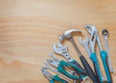 Narzędzia pracy na tle rustykalne drewniane. Widok z góry. Miejsce