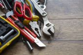 Zdjęcie "Narzędzia pracy na tle rustykalne drewniane. Widok z góry. Miejsce" może być wykorzystywane do celów osobistych i komercyjnych zgodnie z warunkami zakupionej licencji Royalty-free. Obraz jest dostępny do pobrania w jakości wysokiej rozdzielczości do 5760x3840.