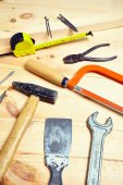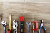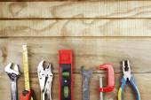 Narzędzia pracy na tle rustykalne drewniane. Widok z góry. Miejsce
