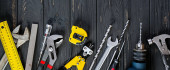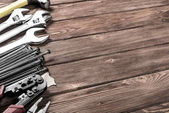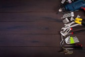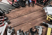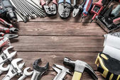 Narzędzia pracy na tle rustykalne drewniane. Widok z góry. Miejsce