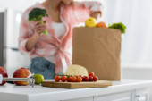 Dziewczyna Blondynka trzyma kalafior i brokuły w pobliżu torby papierowej