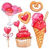 Zdjęcie "Akwarela z różowy słodycze lody, lody owocowe, pączki, motyle, słodycze, Kawa, serca. Ilustracja." może być wykorzystywane do celów osobistych i komercyjnych zgodnie z warunkami zakupionej licencji Royalty-free. Obraz jest dostępny do pobrania w jakości wysokiej rozdzielczości do 5760x3840.