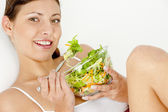 Zdjęcie "Kobieta je sałatkę." może być wykorzystywane do celów osobistych i komercyjnych zgodnie z warunkami zakupionej licencji Royalty-free. Obraz jest dostępny do pobrania w jakości wysokiej rozdzielczości do 5760x3840.