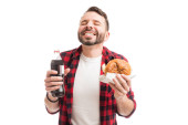 Pełna długość fan piłki nożnej ciesząc meczu z Fast food na białym tle