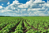 wiosnę krajobraz - pole rolnych z młodej kapusty, zielone rośliny na czarnej ziemi i piękne niebo