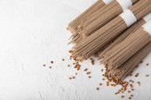 Makaron soba gryka niegotowane na rustykalne drewniane deska nad odrobina