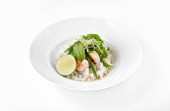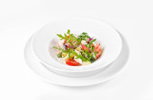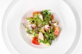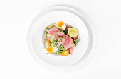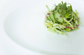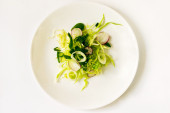 Sałatka z zielonych warzyw brokuły, cukinia i orzech opatrunku na talerzu na białym tle, widok z góry