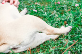 przycięte widok kobiety dotykając cute Buldog francuski leżąc na dywan