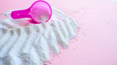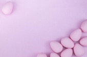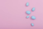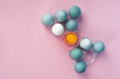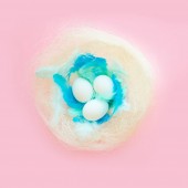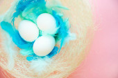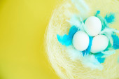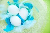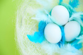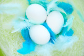 kolorowe tło na Wielkanoc, jajka w gnieździe z niebieskimi piórami