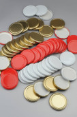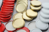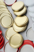 Różne nakrętki do szklanych słoików. Do puszkowania, konserwy. Białe, czerwone, Złote czapki na szarym tle