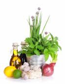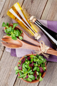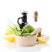 sałata w kosz owoców cytryny, pieprzu, dzbanki, oliwy i octu.