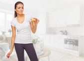Sportowa kobieta rzuca pomarańczowe, dopasowane śniadanie do kuchni. Kobieta w domu rano, styl życia