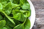 Liście szpinaku świeżego w misce na drewnianym stole.