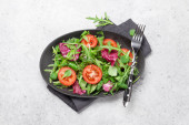 Zielona sałatka płyta mix z Rucola, Frisee, radicchio i sałaty jagnięcej na tle kamienia