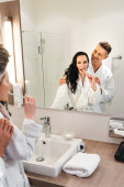 stylowe zaskoczone kobiety w szlafroki i biżuteria z ręcznikami na głowach za pomocą smartfona podczas śniadania