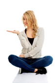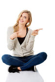 szczęśliwi, podekscytowani, młoda kobieta, wskazując na miejsce