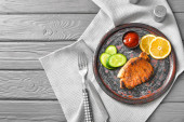 Zdjęcie "Cielęcina stek na talerzu warzyw. Na drewnianym tle. Widok z góry. Wolne miejsce na tekst." może być wykorzystywane do celów osobistych i komercyjnych zgodnie z warunkami zakupionej licencji Royalty-free. Obraz jest dostępny do pobrania w jakości wysokiej rozdzielczości do 5760x3840.