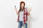 Portret uśmiechniętej młodej kobiety w paski kurtki wskazujące indeks