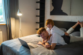 Młoda międzynarodowa para gejów w kłótni w domu w sypialni