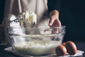 przycięte widok dziecka Dodawanie jaj do mąki w szklanej misce
