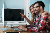 szczęśliwa para w t-shirty za pomocą laptopa w domu