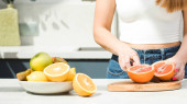 Atrakcyjna dziewczyna w odzieży sportowej przygotowuje zdrowe śniadanie w kuchni przed treningiem, krojeniem owoców i przygotowywaniem świeżego soku. Zdrowy styl życia, sprawność i piękno