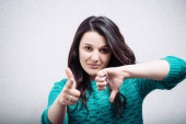 Zdjęcie "Młoda kobieta myśli na szarym tle." może być wykorzystywane do celów osobistych i komercyjnych zgodnie z warunkami zakupionej licencji Royalty-free. Obraz jest dostępny do pobrania w jakości wysokiej rozdzielczości do 5760x3840.