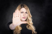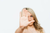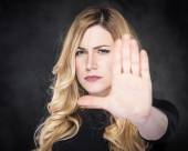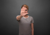Kobieta wyciąga jej dłoń do przodu. Znak Stop. Na szarym tle.
