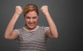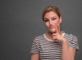 Kobieta przedstawia pogardy plotek lub niezadowolenie na szarym tle.
