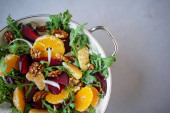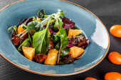 Sałatka z wątrobą, rukolą, pomarańczą, szpinakiem i migdałami na płycie na ciemnym kamiennym podłożu. Koncepcja zdrowej żywności. Widok z góry.