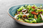Zdjęcie "Sałatka z wątrobą, rukolą, pomarańczą, szpinakiem i migdałami na płycie na ciemnym kamiennym podłożu. Koncepcja zdrowej żywności. Widok z góry." może być wykorzystywane do celów osobistych i komercyjnych zgodnie z warunkami zakupionej licencji Royalty-free. Obraz jest dostępny do pobrania w jakości wysokiej rozdzielczości do 5760x3840.