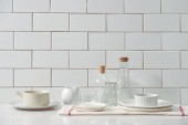Proste rustykalne naczynia kuchenne białe ściany drewniane: szorstki ceramiczny garnek z drewnianych gotowania przybory zestawu, stosy ceramiczne miski, dzbanek i Tace drewniane.