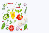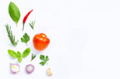 Różne świeże warzywa i zioła na białym tle. Zdrowe