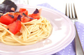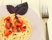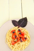 spaghetti z pomidorami i bazylia liści na białym tle