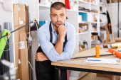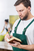zawód, praca, ludzie, robotnik w specjalnych ubraniach z papierem